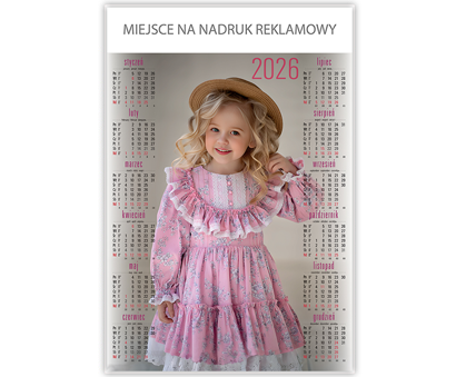 format 67x98 cm, papier kreda 170 g, druk CMYK, lakier dyspersyjny, oprawa w kolorowe listwy, pole pod nadruk reklamowy 670 x 115 mm, sugerowany wymiar nadruku 630 x 90 mm