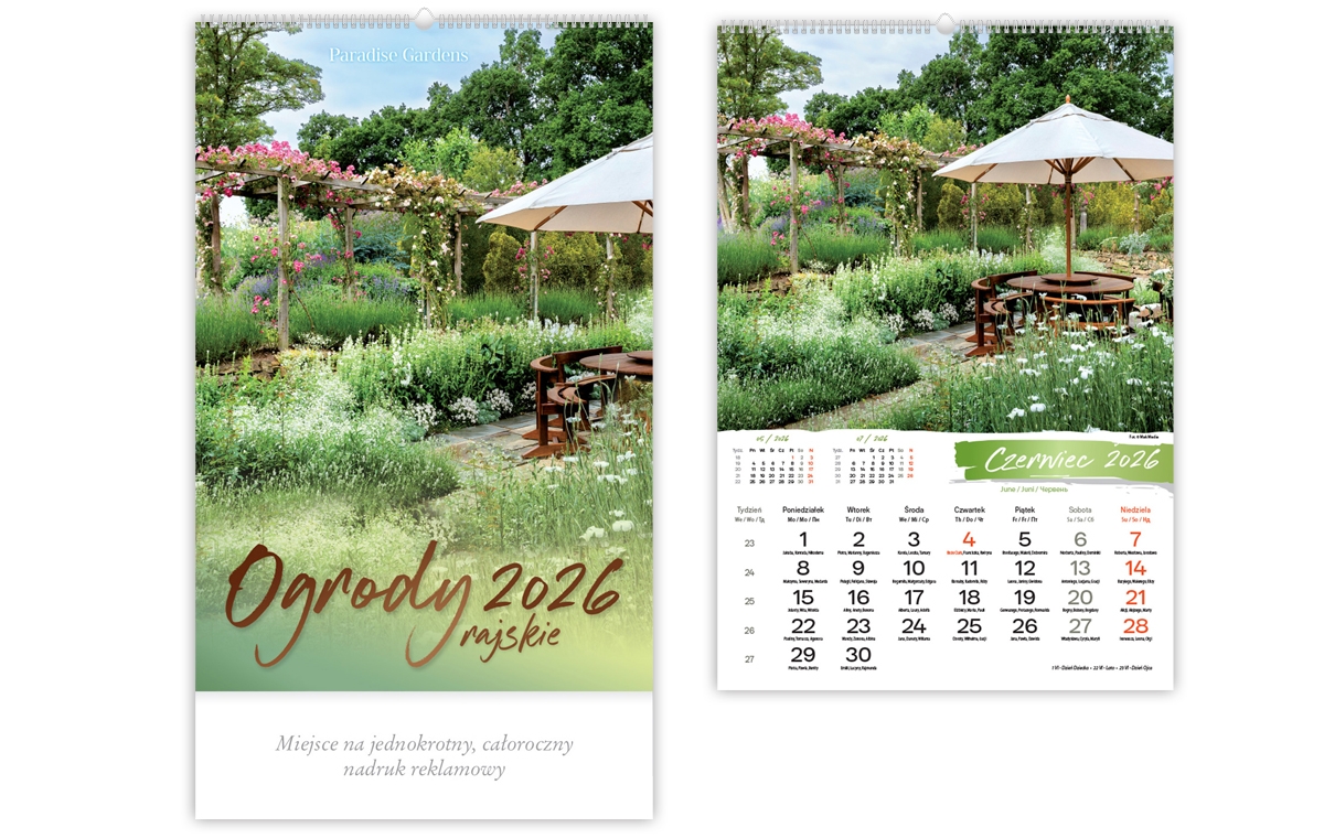 Format 320 x 560 mm format kalendarium - 330 x 475 mm objętość - 13 plansz, papier - kredowany 130 g/m2, okładka 250g/m2 druk kalendariów - 4 kolory podkład - biały oprawa - oczka o-wire z zawieszką pole pod nadruk reklamowy - 320x90 mm