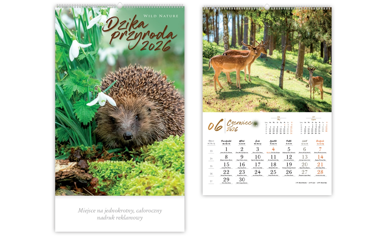 Format 320 x 560 mm format kalendarium - 330 x 475 mm objętość - 13 plansz, papier - kredowany 130 g/m2, okładka 250g/m2 druk kalendariów - 4 kolory podkład - biały oprawa - oczka o-wire z zawieszką pole pod nadruk reklamowy - 320x90 mm
