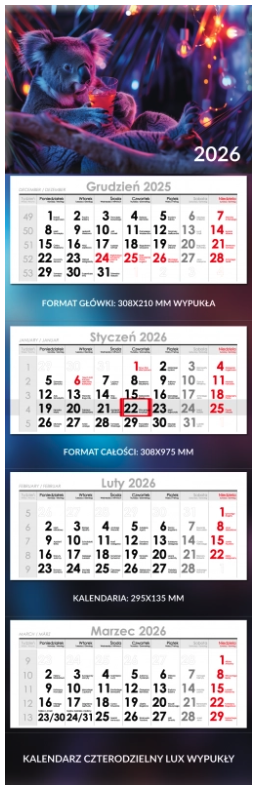 Kalendarz czterodzielny z główką wypukłą błysk lub mat. Nadruk full color na główce + nadruk na pleckach. 4 x 12 kalendariów dwukolorowych. Wymiar 308x975mm