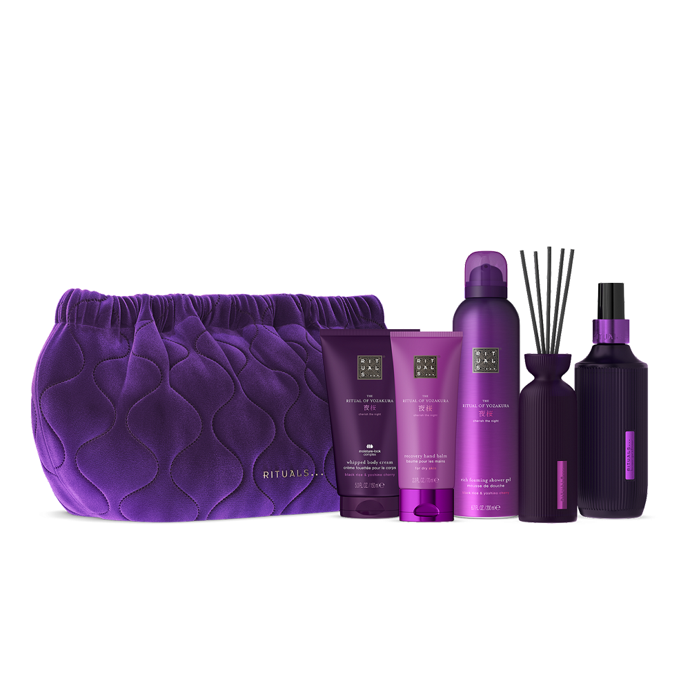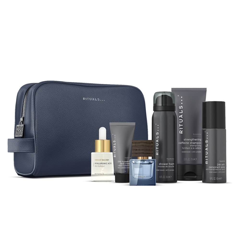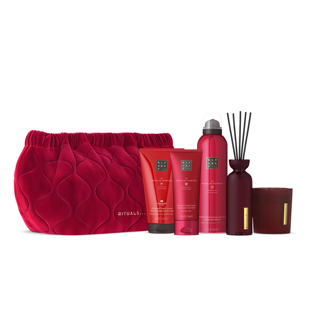 Efektowny zestaw Rituals w skład którego wchodzi 5 wyjątkowych produktów wraz z elegancką kosmetyczką. Zestaw dostępny w 7 wariantach zapachowych. Zestawy w zależności od wyboru zawierają: krem do ciała 150ml, żel do mycia 200ml, balsam do rąk 70ml, patyczki zapachowe 70ml, świeca zapachowa 140mg, balsam do ciała w musie 150ml, perfumy 15ml, anty-perspirant 50ml, booster z kwasem hialuronowym 20ml, krem do twarzy 20ml, szampon do włosów z kofeiną 70ml, perfumy do wnętrz 200ml, maska do rąk i stóp 70ml