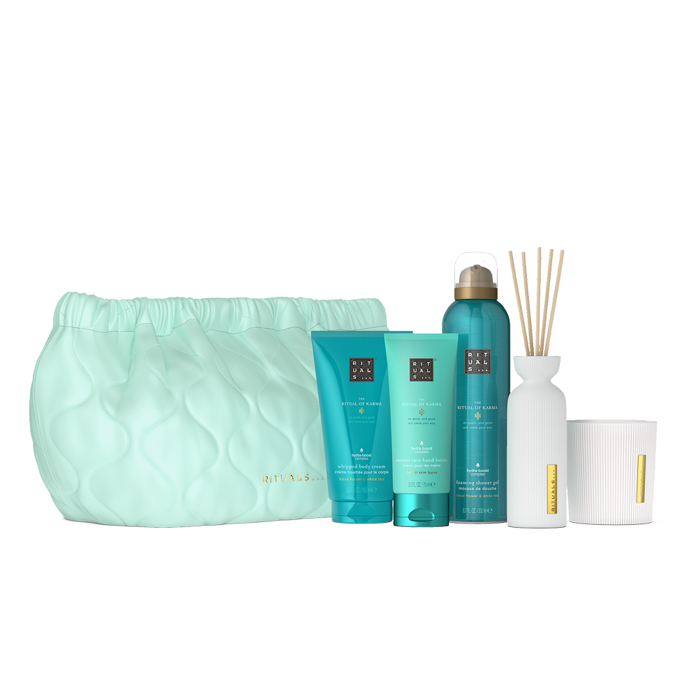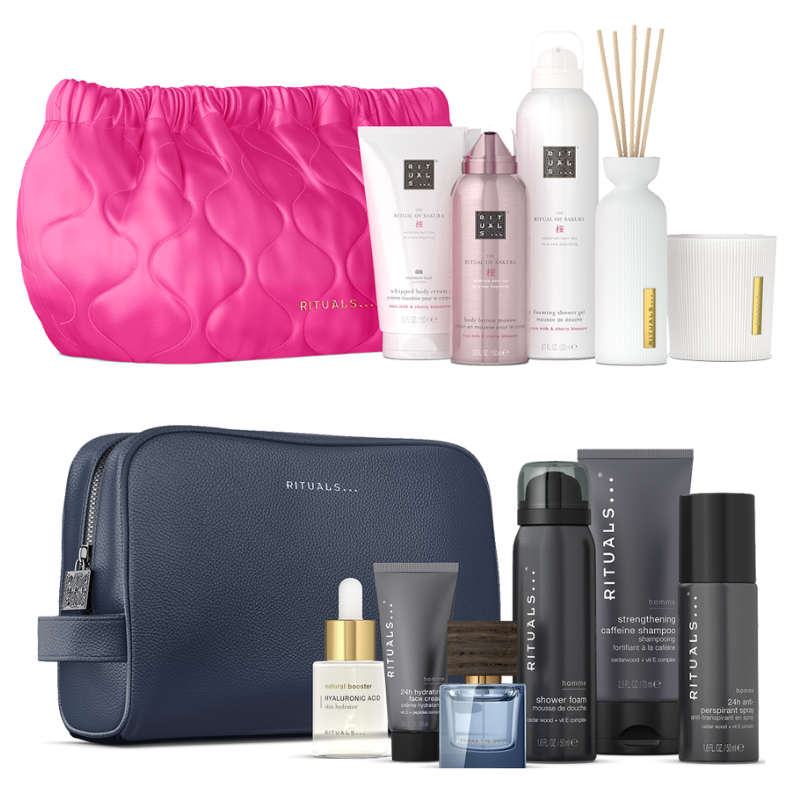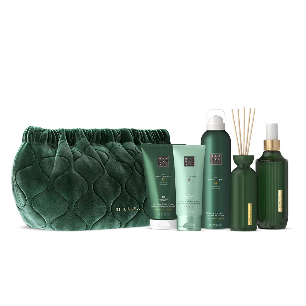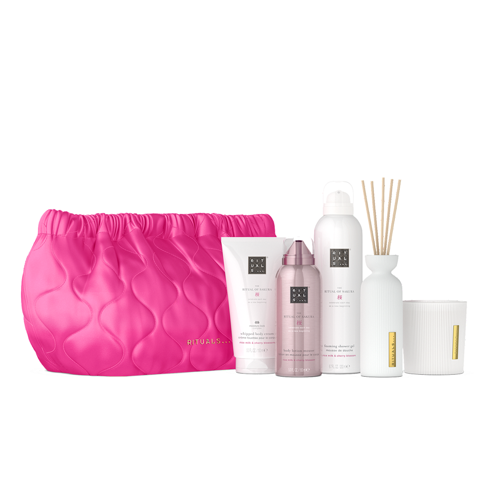 Efektowny zestaw Rituals w skład którego wchodzi 5 wyjątkowych produktów wraz z elegancką kosmetyczką. Zestaw dostępny w 7 wariantach zapachowych. Zestawy w zależności od wyboru zawierają: krem do ciała 150ml, żel do mycia 200ml, balsam do rąk 70ml, patyczki zapachowe 70ml, świeca zapachowa 140mg, balsam do ciała w musie 150ml, perfumy 15ml, anty-perspirant 50ml, booster z kwasem hialuronowym 20ml, krem do twarzy 20ml, szampon do włosów z kofeiną 70ml, perfumy do wnętrz 200ml, maska do rąk i stóp 70ml