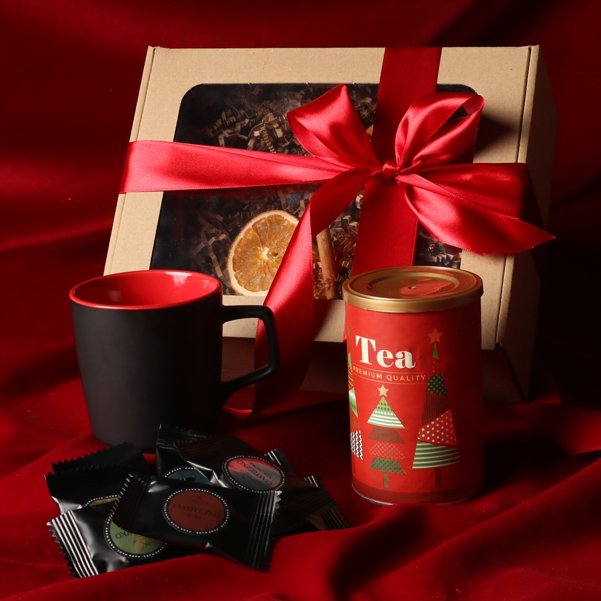 W skład zestawu wchodzą: kubek Barrel Supreme czarno-czwrwony / czarny-reflex blue / czarny-czarny z możliwością zdobienia, zielona herbata Sencha z wiśniami, płatkami róży zapakowana w tubę z motywem zimowym, 8 stuk czekoladek - mix smaków. Całość w stylowym opakowaniu z tektury eco z okienkiem. Opcje dodatkowej customizacji: nadruk na kubku, bilecik z logo firmy, wstążka lub obwoluta z motywem zimowym wzbogacona złoceniem.
